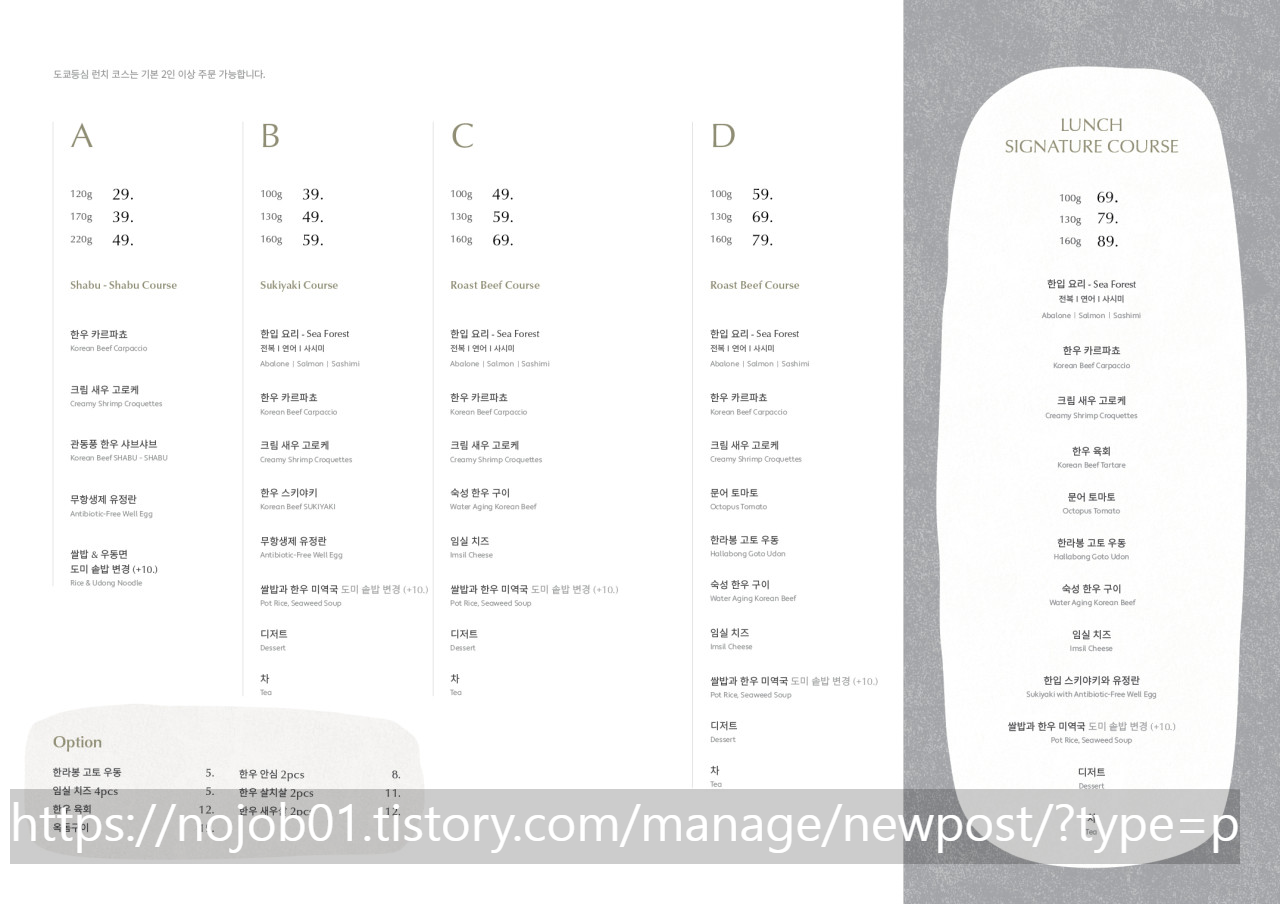 런치코스는 29,000원~89,000원까지 다양한 금액대로 구성되어 있더라구요.