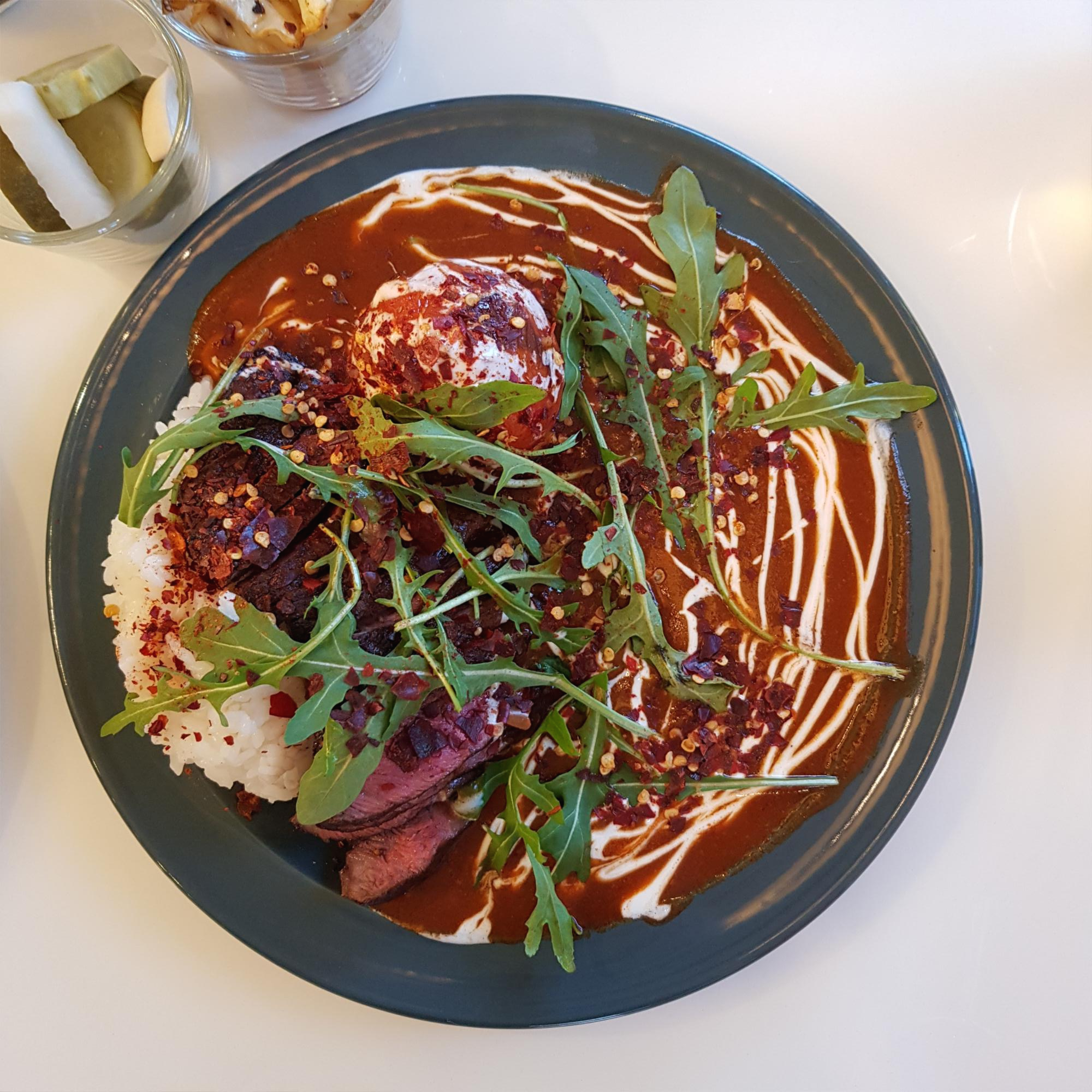 덜 매우면서 부챗살 스테이크가 들어간 '스테이크 레드커리'를 주문했습니다.