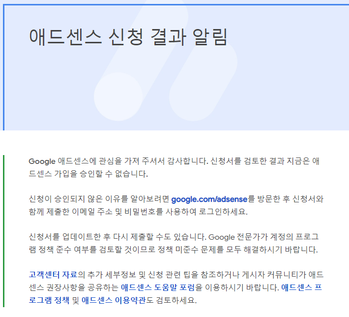이럴거면 애드센스 신청 당시에 신청불가라고 띄워줬으면 좋았을텐데 말이죠ㅠ