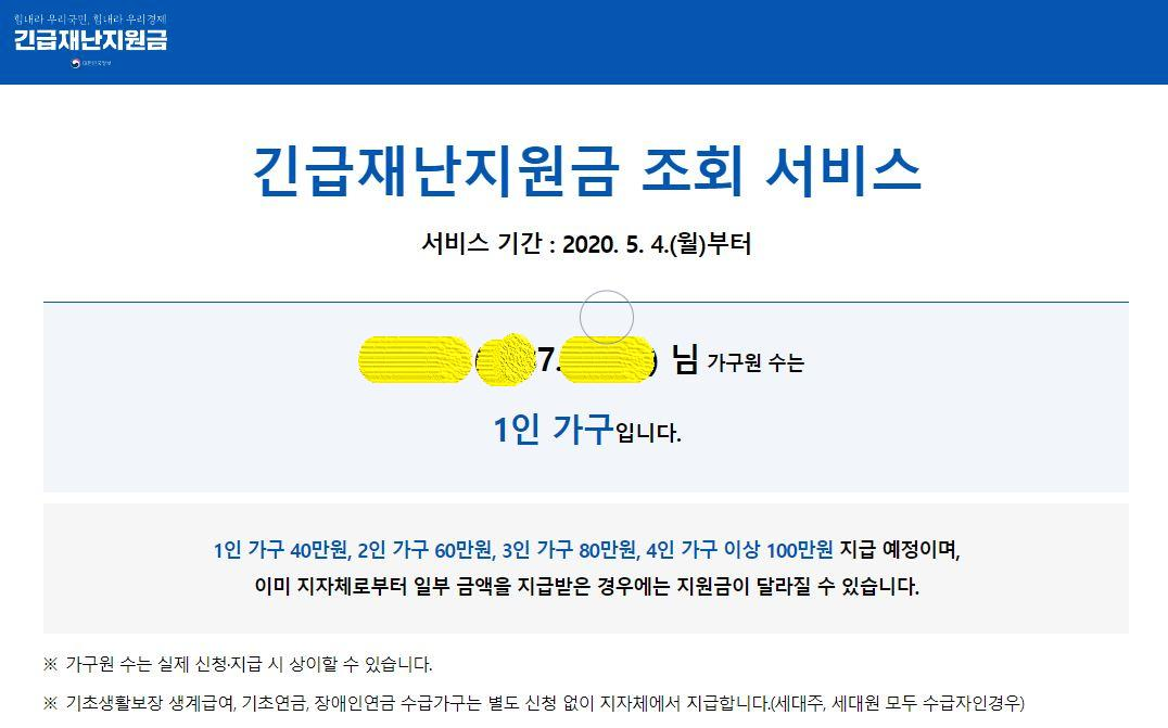 긴급재난지원금 대상 세대주 여부와 가구원 수를 확인, 조회할 수 있게 되었죠.