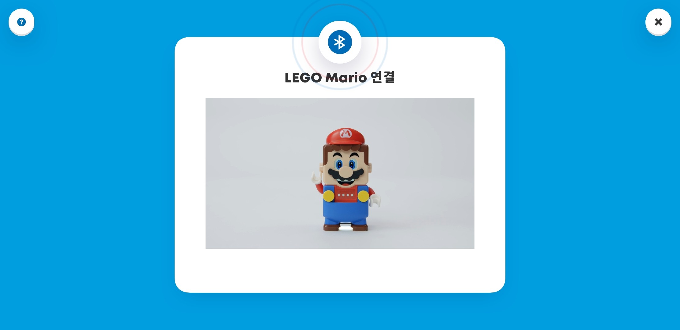 앱을 켜면 LEGO Mario 연결 페이지가 나올거에요. 이 때 블루투스 버튼을 클릭해주면 연결완료라고 나옵니다:)