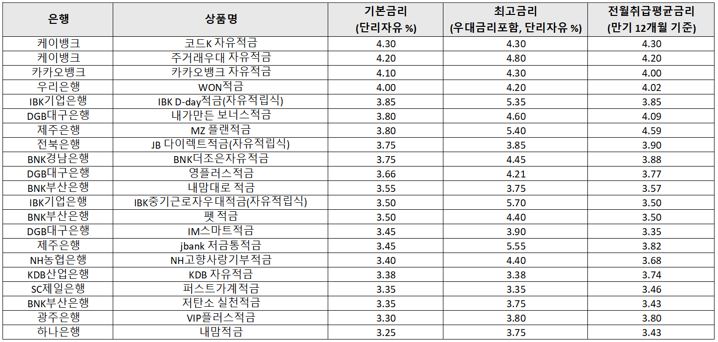 아래 표는 1년 만기 정기적금 중 기본금리가 높은 상품으로,